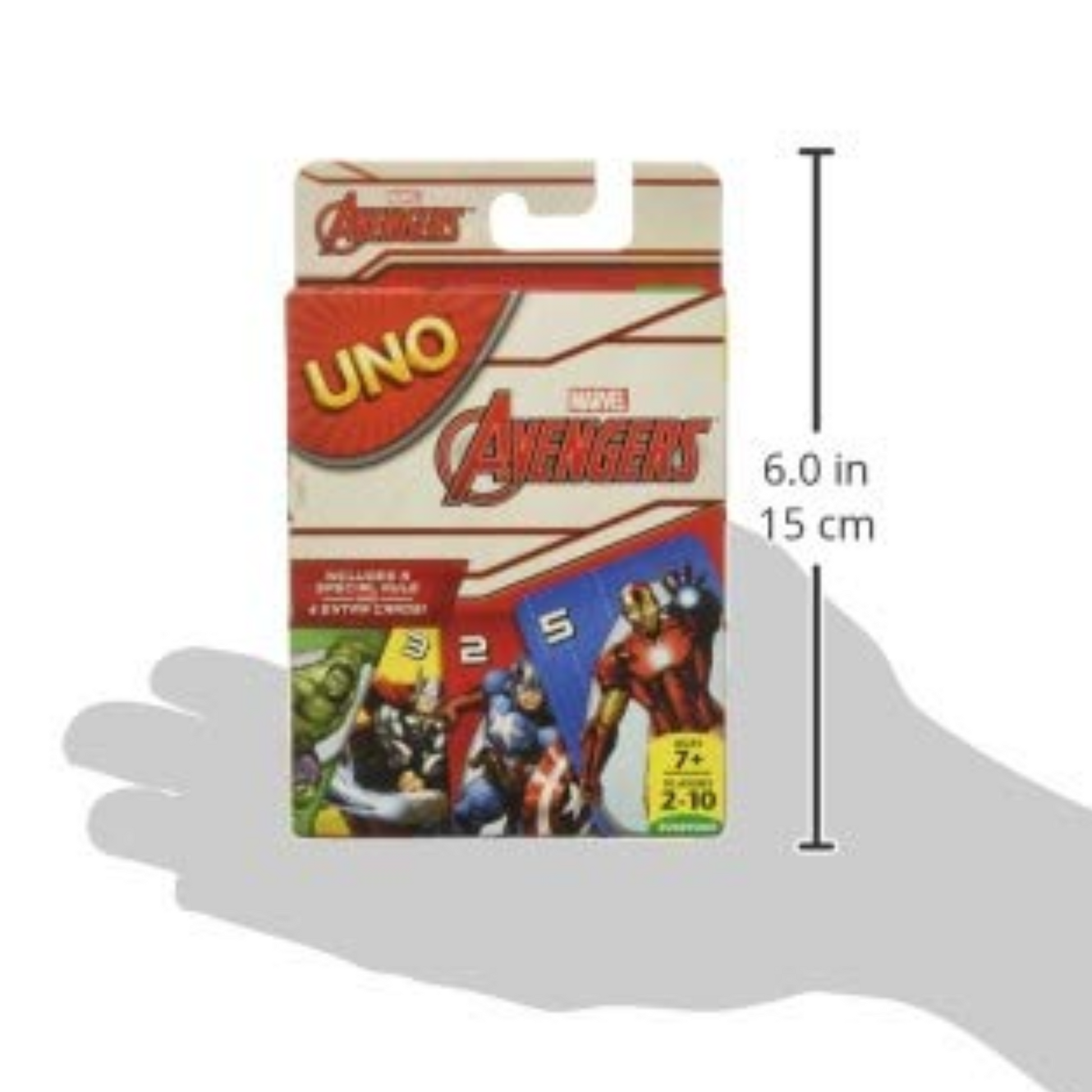 Experience the thrill of the Marvel Universe with UNO Avengers Edition! Play alongside your favorite superheroes, including Iron Man, Captain America, Thor, Hulk, and more, in this action-packed twist on the classic UNO game.